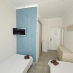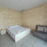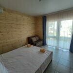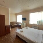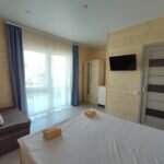 Однокомнатный люкс с балконом — номер общей площадью 22 кв.м. с шикарным видом на море, двухспальной кроватью, большим диваном, LED телевизором, холодильником, кондиционером и мебелью на балконе.